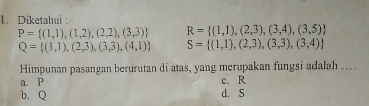 Himpunan pasangan berurutan berikut yang merupakan fungsi adalah: